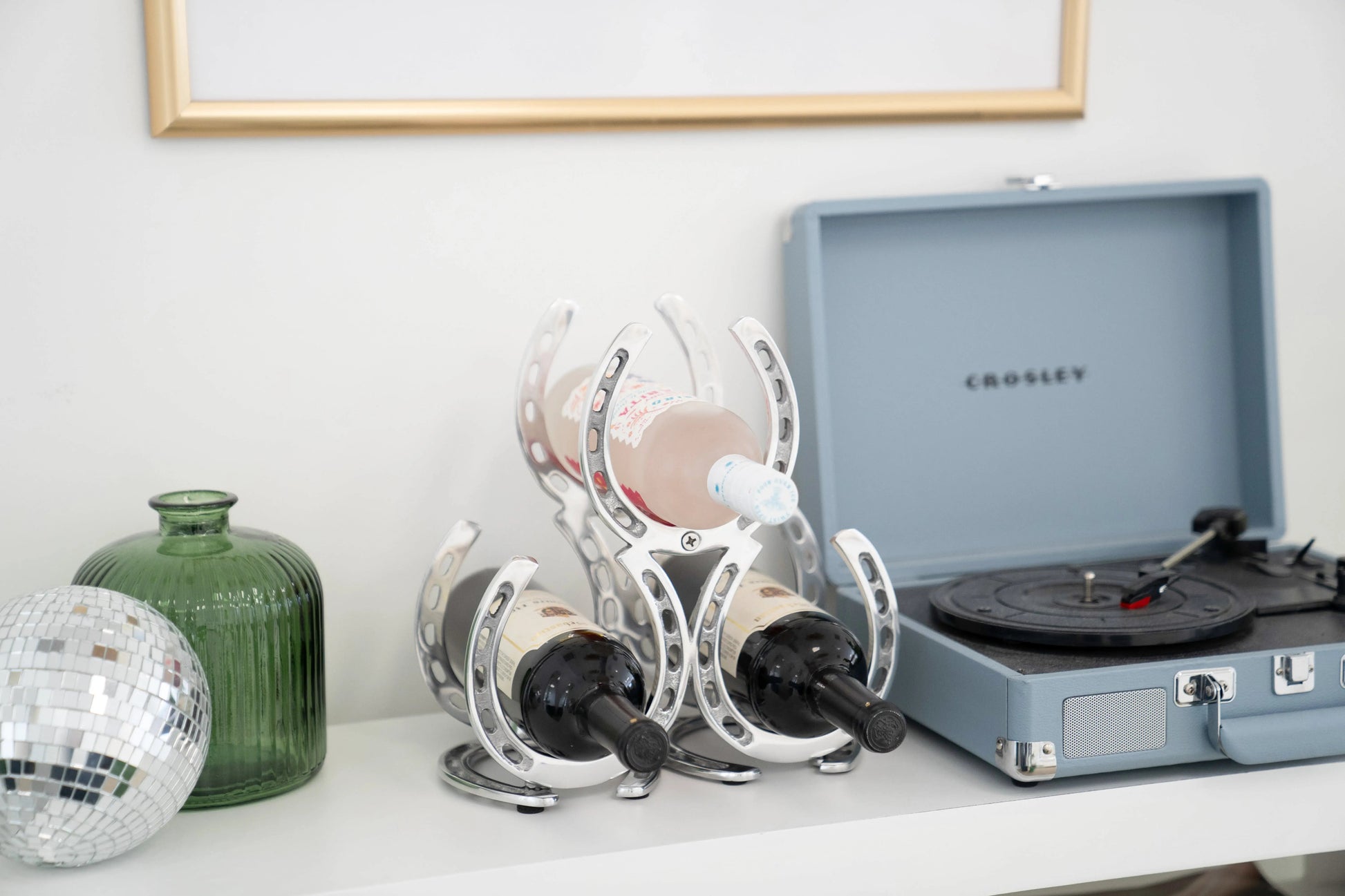 Huntley Horseshoe 3-Bottle Wine Rack, a perfect blend of rustic charm and modern elegance. Crafted from durable aluminum with a sleek silver finish, this wine rack features an artful arrangement of horseshoes, symbolizing luck and equestrian sophistication. Designed to securely hold up to three standard-sized wine bottles, it adds a stylish touch to any kitchen, bar, or dining area. Whether you're a wine enthusiast, an equestrian lover, or looking for a unique gift, this wine rack is both a functional and decorative statement piece.